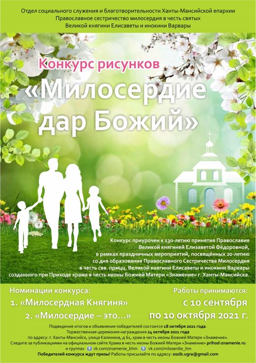 Конкурс проводится в рамках праздничных мероприятий, посвящённых 20-летию со дня образования Православного Сестричества Милосердия в честь свв. прмцц. Великой княгини Елисаветы и инокини Варвары созданного при Приходе храма в честь иконы Божией Матери «Знамение» г. Ханты-Мансийска.